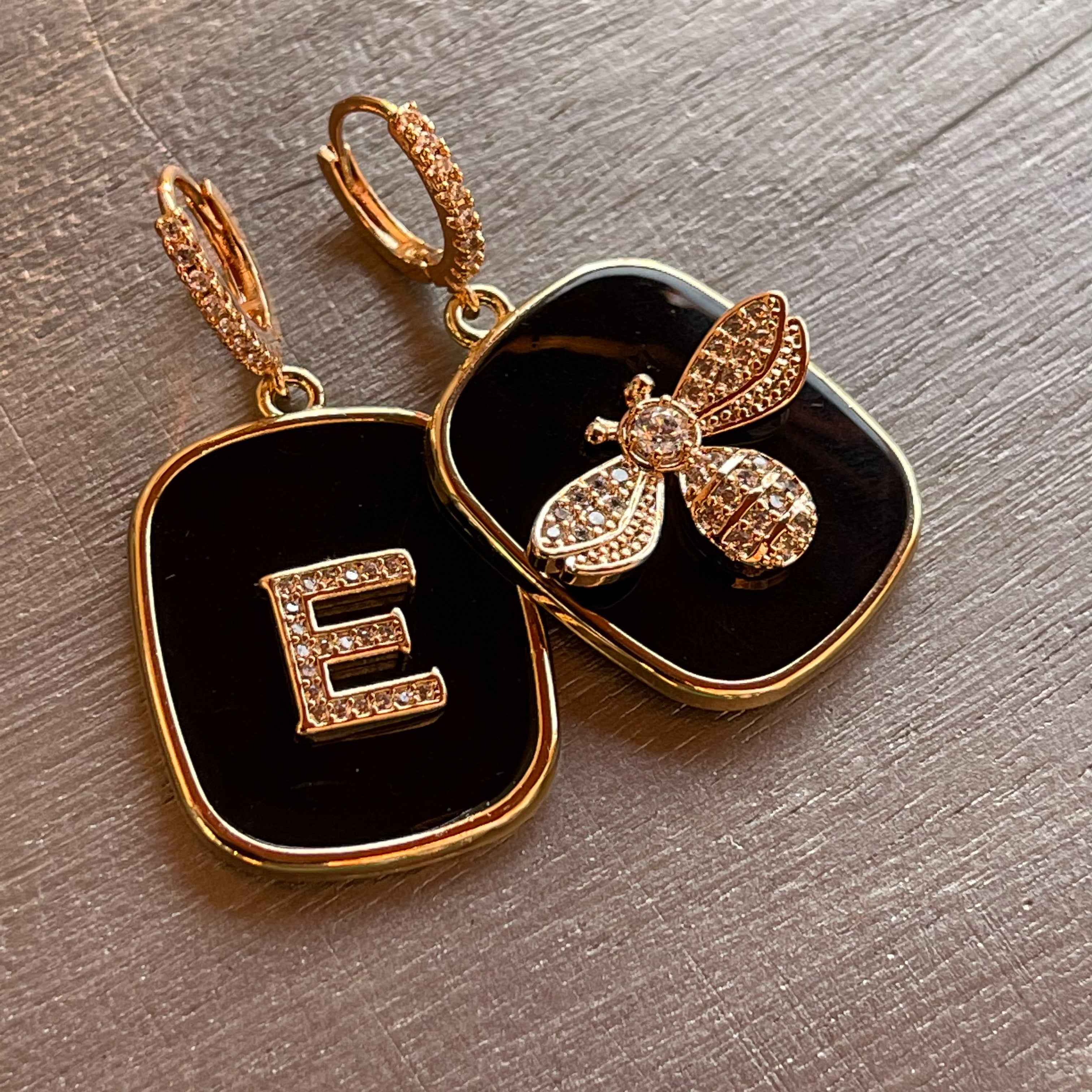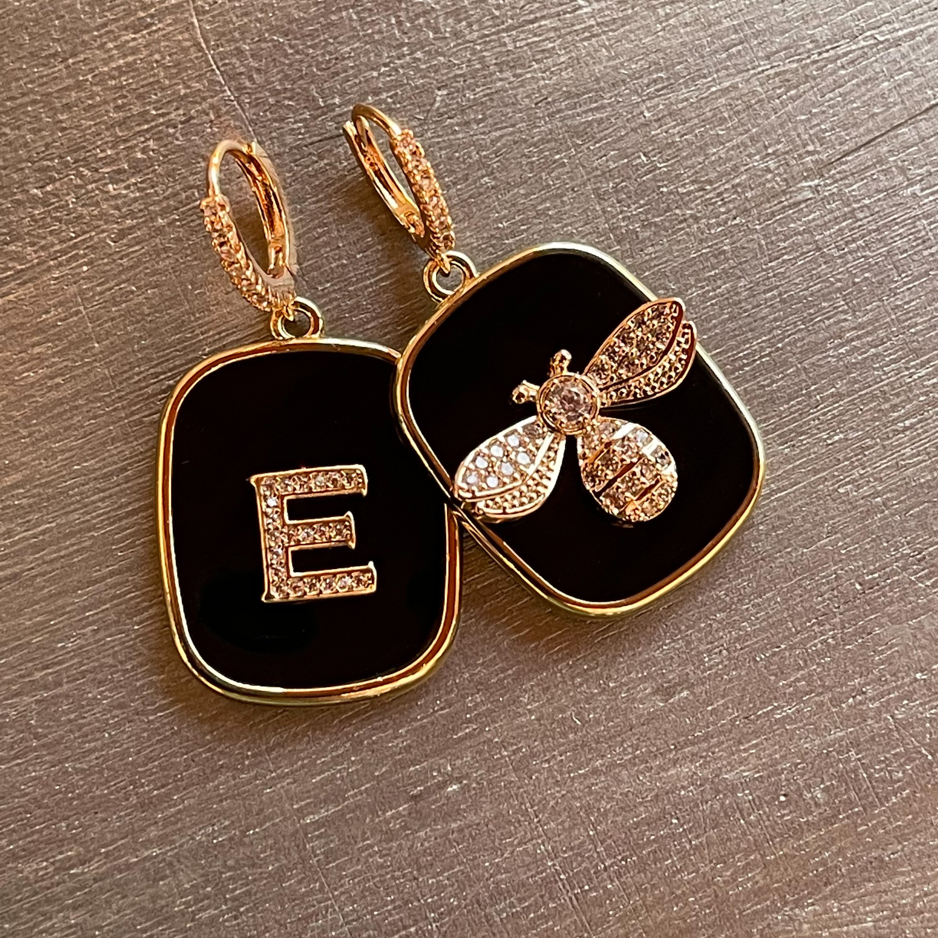 PIASTRINE LETTERA E APINA ORECCHINI NERI