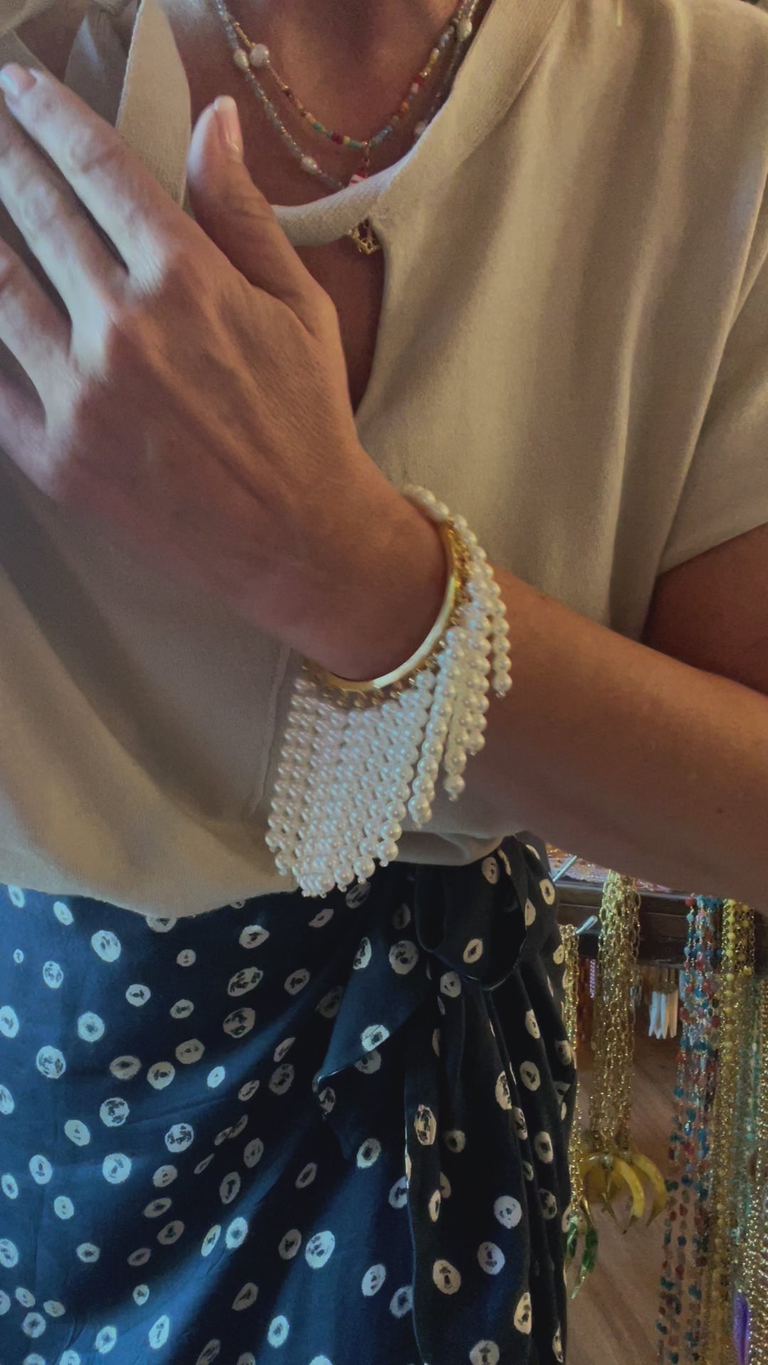 Bracciale in esclusiva sito, semirigido in lega di zinco con galvanica dorata nichel free con frange di perle in vetro madreperlato. PRODOTTO IN ESCLUSIVA SITO