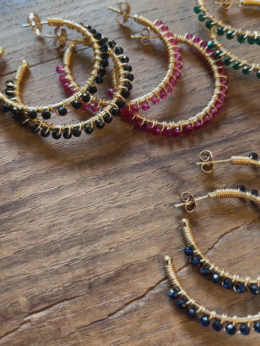 Orecchino realizzato in ottone galvanizzato oro intrecciato con micro cristalli.