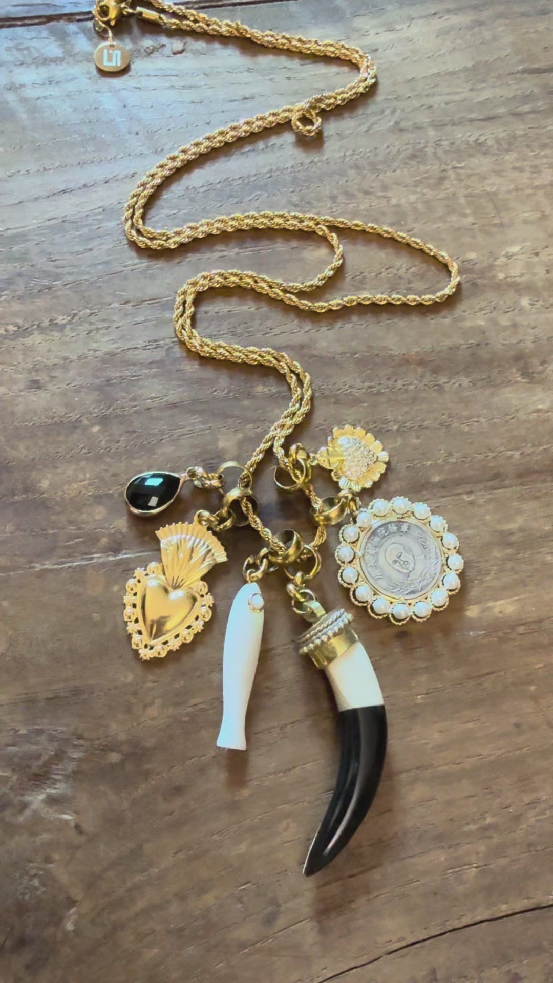Realizzata in acciaio dorato, CHARMY è la collana perfetta per un tocco di eleganza. Con i suoi multi charm, tra cui corno, moneta e cuore sacro, questa collana sottile aggiunge un tocco di stile e sapienza alla tua collezione di gioielli.