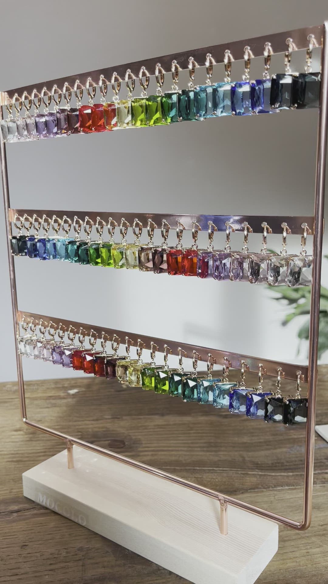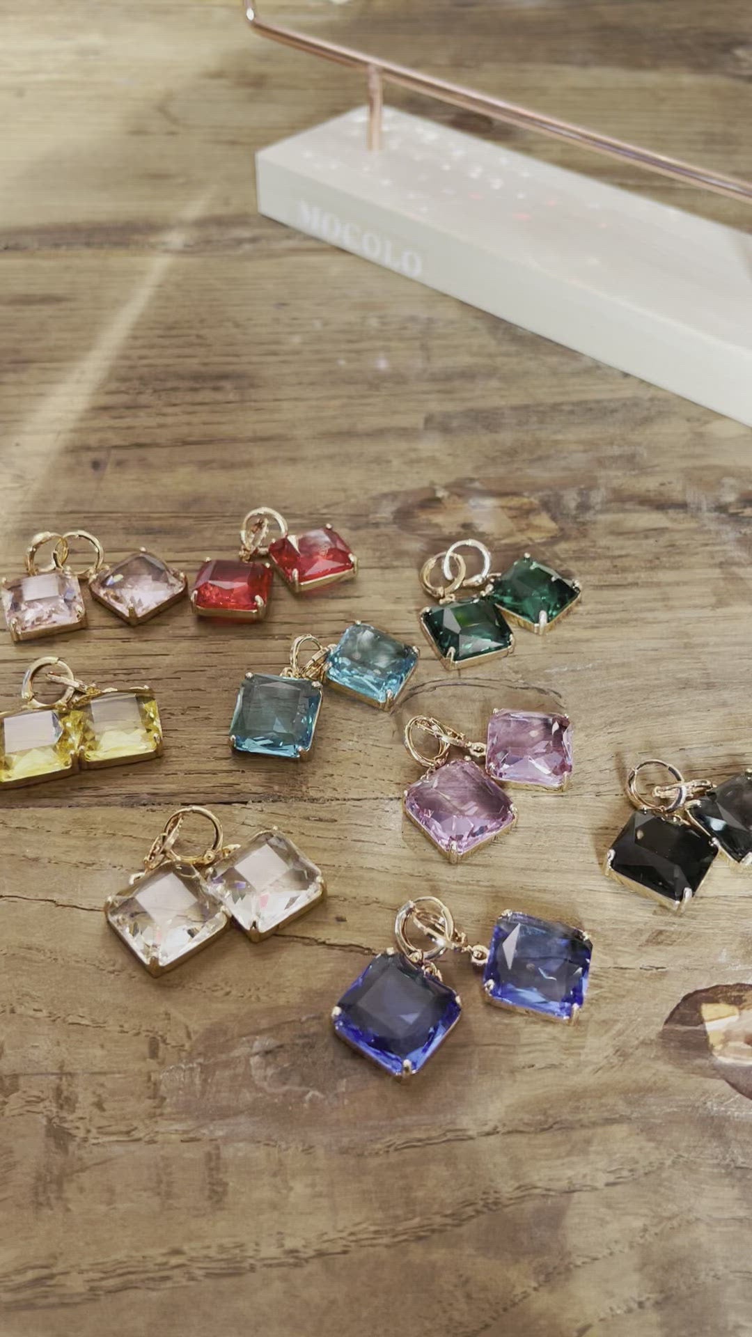 Abbinabile alla collana gli orecchini realizzati anch'essi in ottone galvanizzato oro 24kt con un cristallo quadrato pendente.
