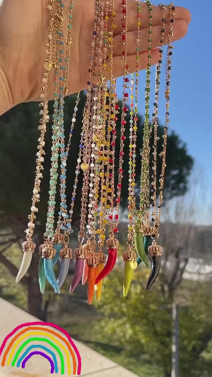 collanine girocollo da 40 cm più catenella da 5 cm in ottone dorato e cristallini colorati con ciondolo a forma di corno - cornetto di 3,5 cm