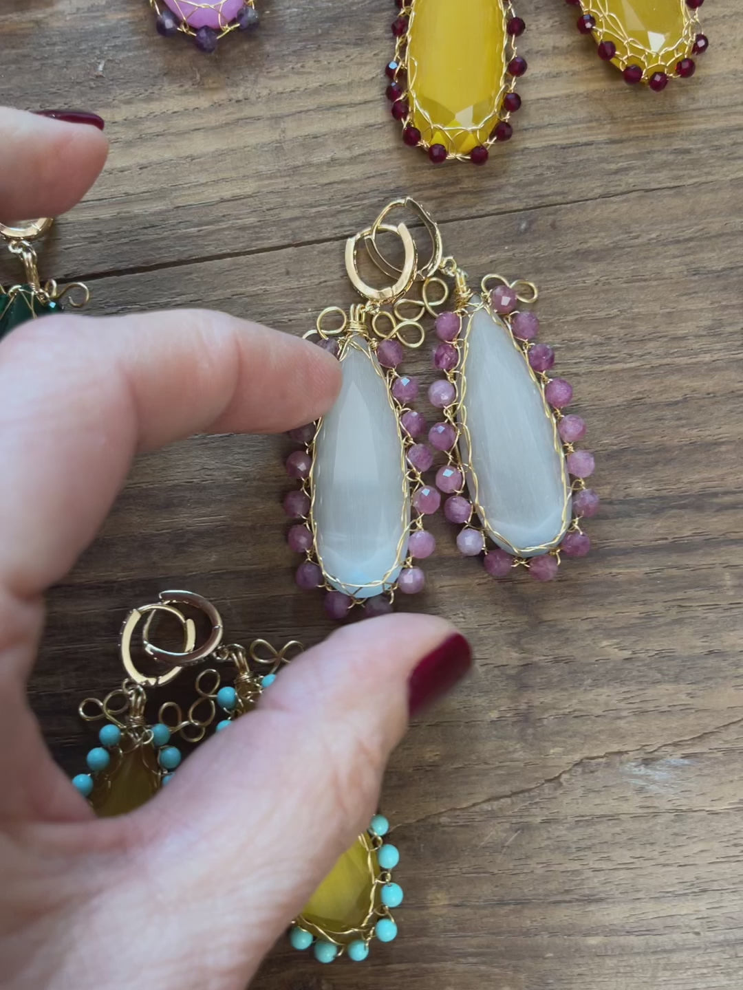 Orecchini a cocci di occhio di gatto con pizzo metallico e micro perle in pietra dura o zirconio. Top in ottone dorato con zirconi in chiusura a scatto. Altezza orecchino 5,5 cm. Nichel free