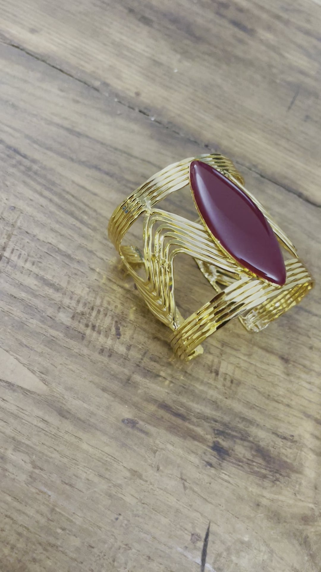 Браслет из золотой латуни, полностью сложенный и откованный вручную, с большим центром из бордовой эмали ручной работы.