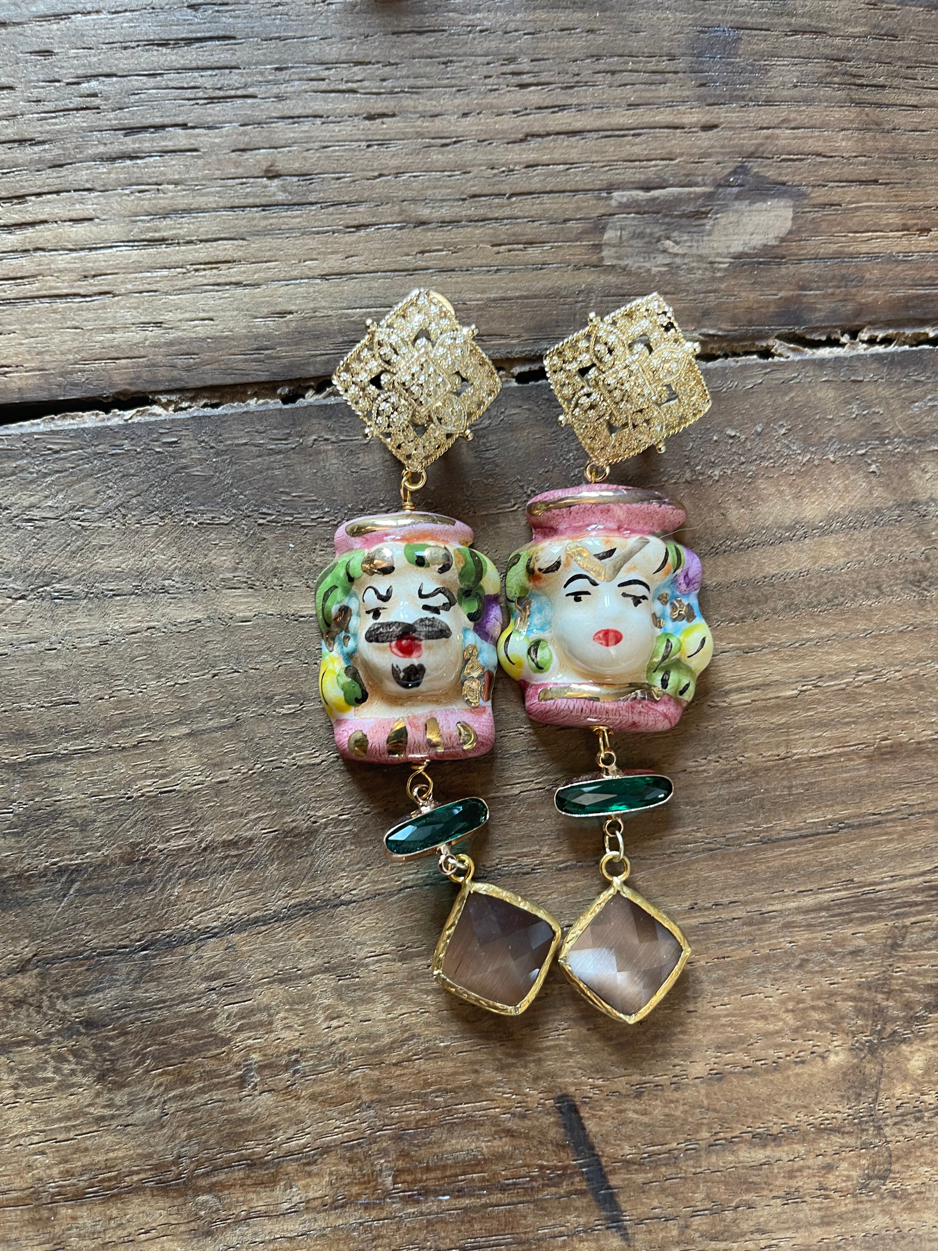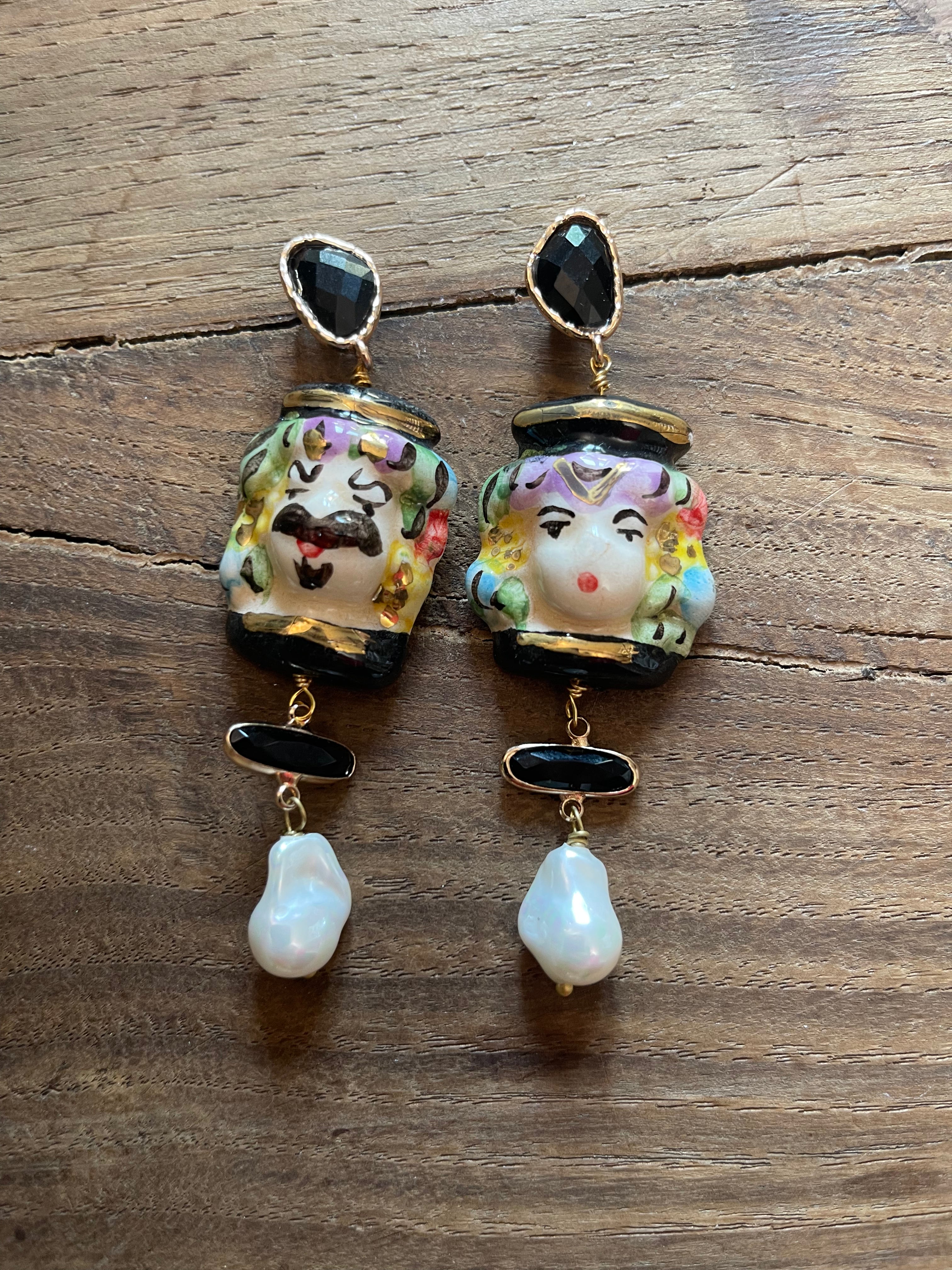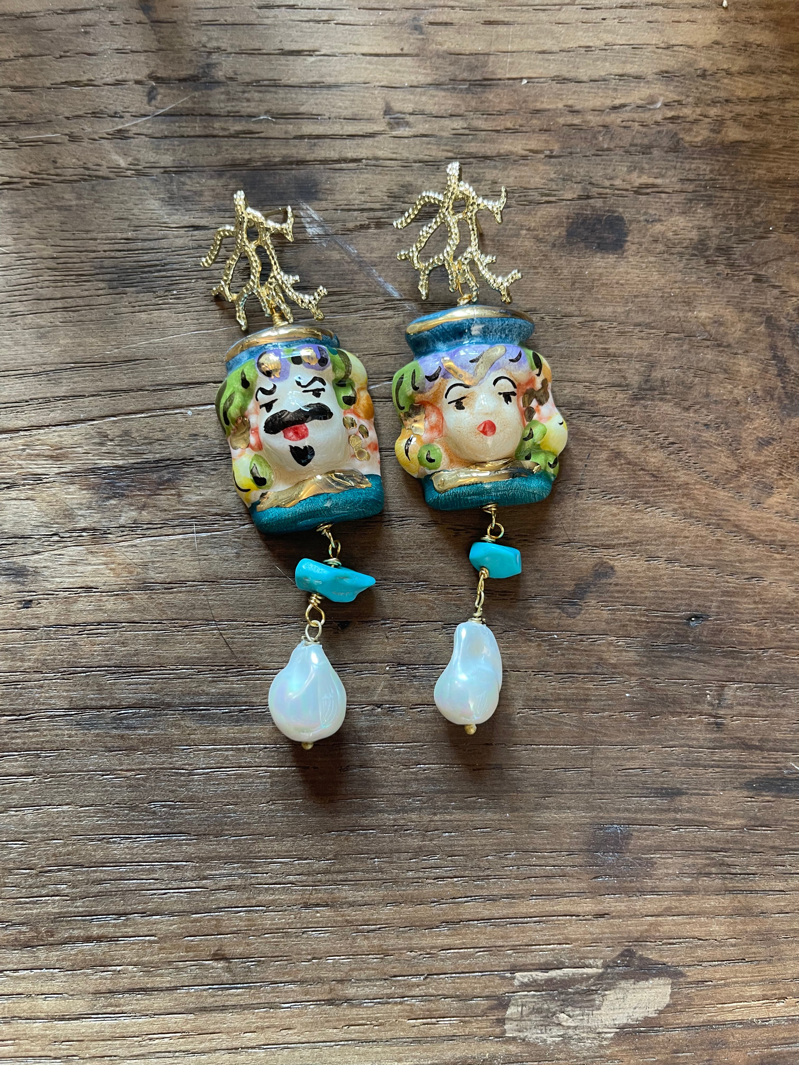Керамические серьги Caltagirone, расписанные вручную, с деталями из чистого золота, жемчугом и кристаллами.