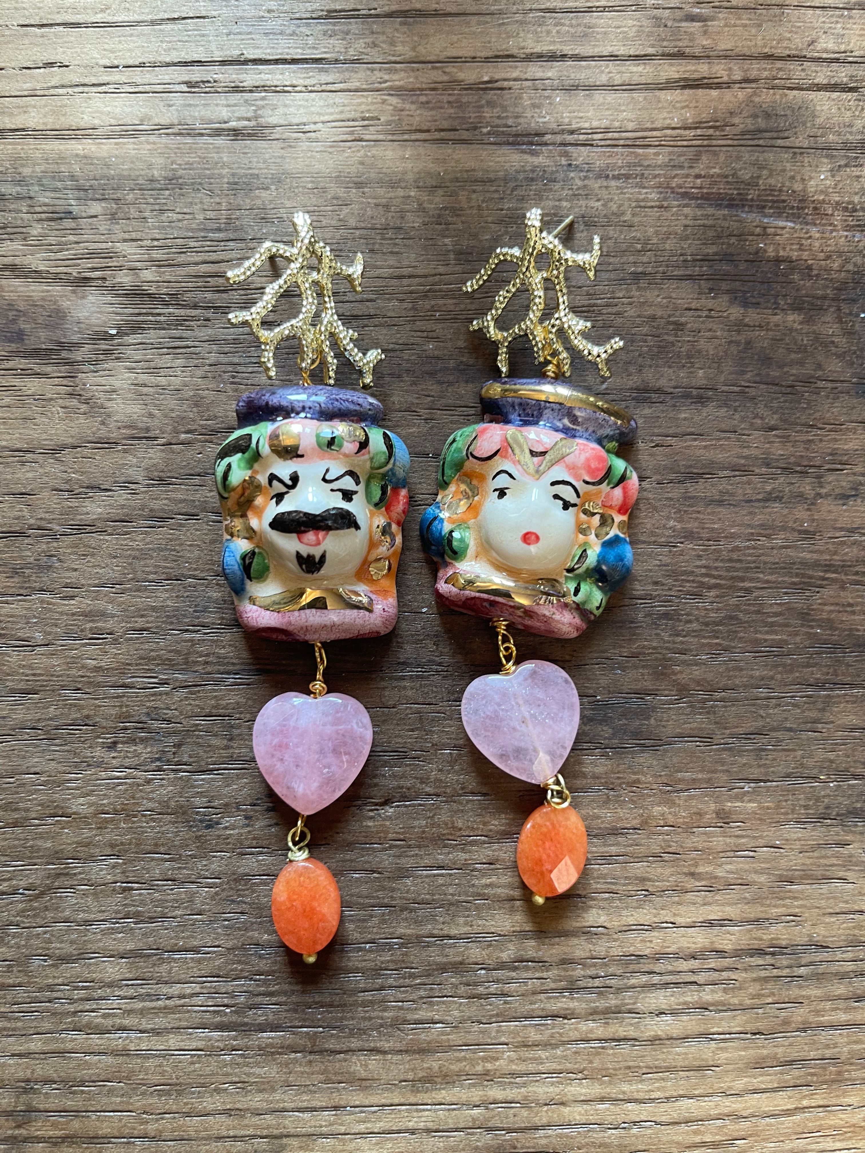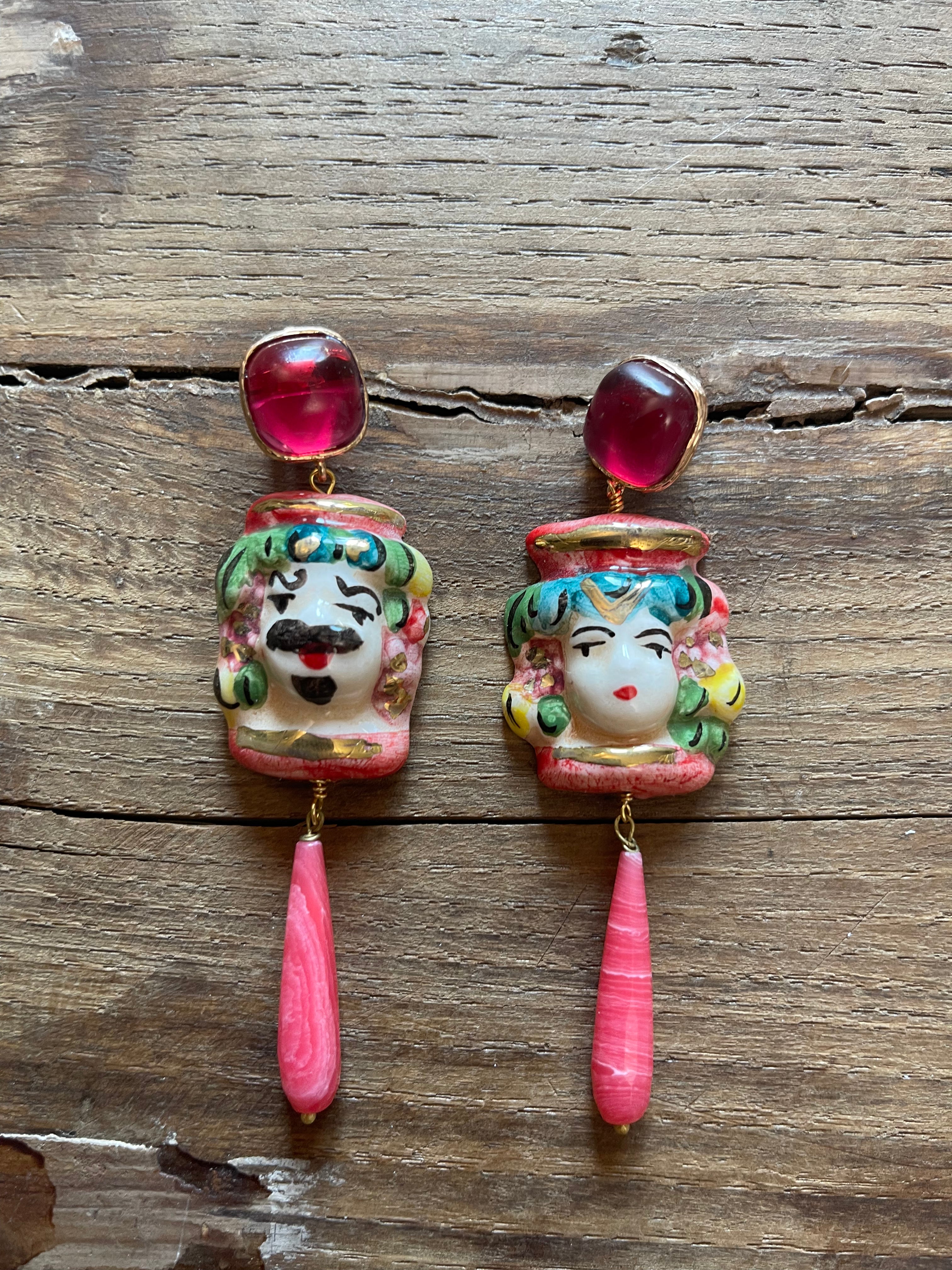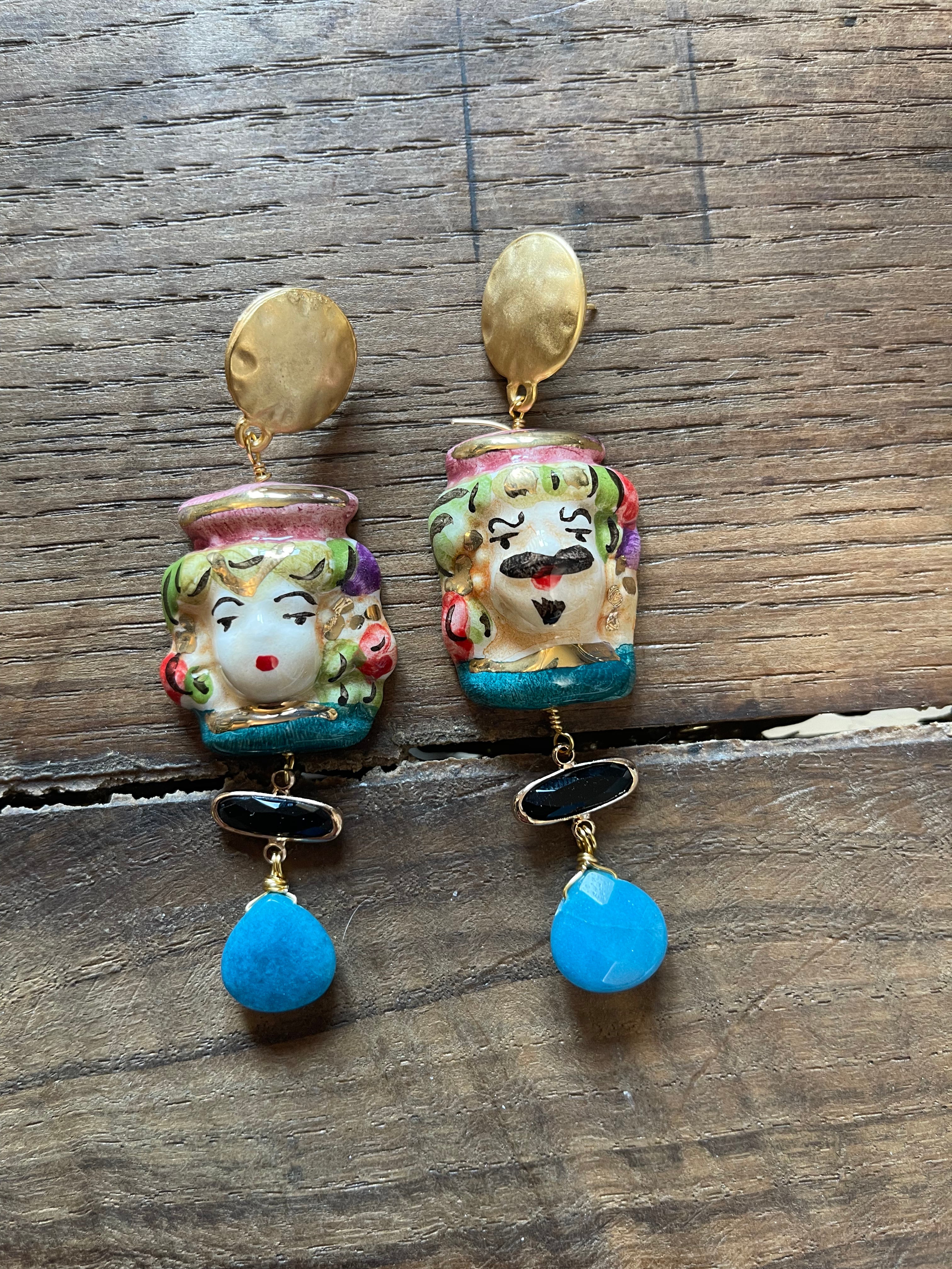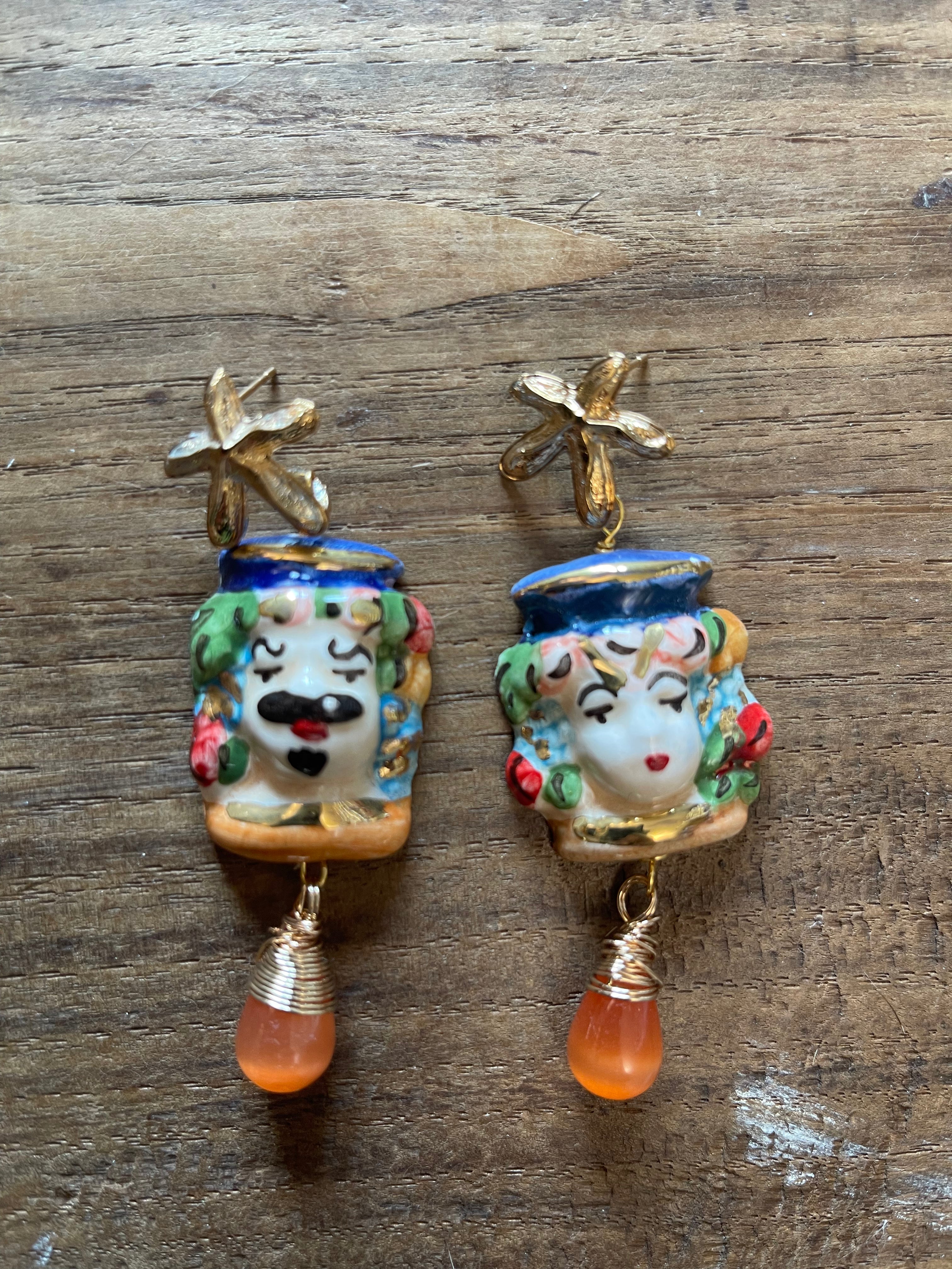 Керамические серьги Caltagirone, расписанные вручную, с деталями из чистого золота, жемчугом и кристаллами.